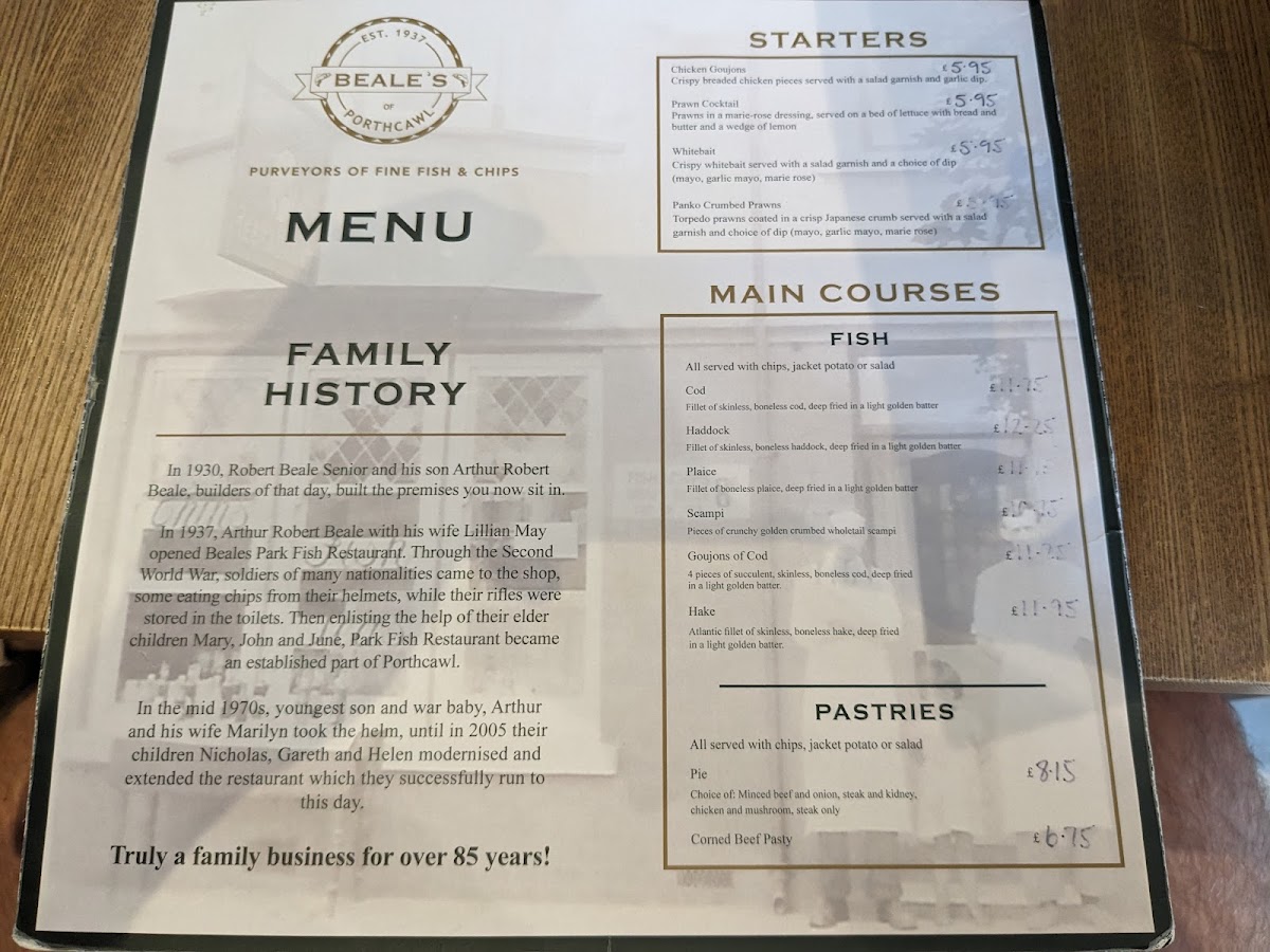 Beale's Park Fish Restaurant Menu